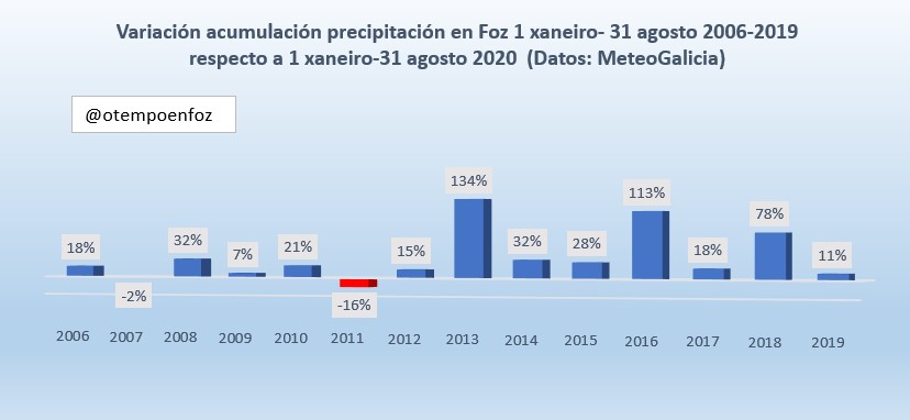 Aínda que finalmente non podemos falar dun verán seco (grazas a agosto), o certo é que ata o 31 de agosto, 2020 é o 3º ano máis seco dende 2006. Ata ese día, acumuláronse uns 413,8mm, o que supón un 16% máis que en 2011 (caeran 64,9mm menos), un 2% máis que en 2007 (caeran 7,9mm menos) e un 134% menos que en 2013 (cando se acumularan 554,4mm máis). Ademais, foron 144,7mm menos que a media, ata o 31 de agosto, do período 2006-2019.